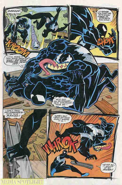 Spider-Man tries to go for his sonic canon, but Venom isn’t a fan of hard rock.