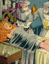 This is supposed to be the scene of a surgical operation! There are two white-gowned and white-capped men beside her, one about to put a chloroform mask over her face, the other holding scissors in his right hand and in his left a knife whose sharp blade is surrounded with a yellow zigzag halo (used in comic books as a rule to designate the effects of cutting or shooting). The whole scene has nothing to do with medicine and is unmistakably sadistic.