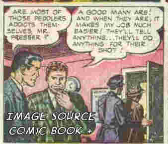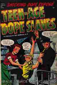 When adolescent drug addiction had finally come to public attention, it led to the publication of lurid new comic books devoted entirely to the subject, like the one with the title, Teen-Age Dope Slaves. This is nothing but another variety of crime comic of a particularly deplorable character.