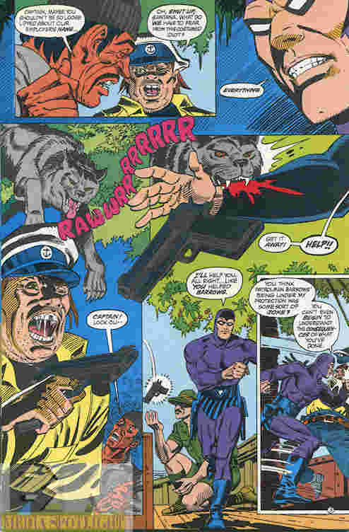The Phantom threatens to sick Devil on the leader if he doesn’t fess up about his boss but one of his underlings has orders to shoot him and kill himself to protect his identity. I said the Phantom doesn’t kill; I didn’t say they wouldn’t die.