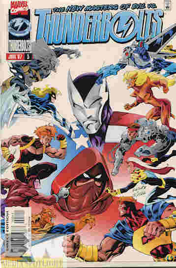 Mach-1 captures a bad guy but steals his loot, which doesn’t sit well with Baron Zemo since it messes with their plans. As Four Freedoms is rebuilt with the Thunderbolts symbol, the “heroes” learn that another group has taken the name Masters Of Evil, only they’re working for a group trying to consolidate the criminal underworld in New York after the Onslaught disaster. Black Widow wants them as well, deciding that she wants to work alone and take down all outstanding criminals the Avengers fought. Eventually the old and new Masters clash, with the Thunderbolts victorious. However, they return home to find a teenage girl…namely Haley, who has escaped from the her captors and seeks the Fantastic Four’s help (not realizing they’re suffering a fate worse than death…namely Heroes Reborn) and she’ll go through the Thunderbolts to do it!