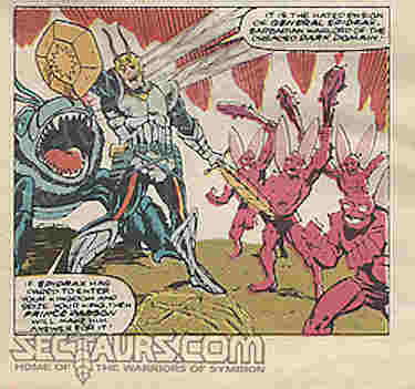 For those of you who missed that, the Sectaurs toyline takes place on the planet Symbion, where a group of scientists accidentally set free a virus that mutated the entire planet. (And you wonder why some people fear science?) The people are turned into bug people and the local bugs into giant insects they ride called Insectoids, to whom they are psychically linked or “telebonded”. The Insectoid toys were actually puppets the figures could ride (except for a few non-ridable Insectoids that had other features), thus giving them a sense of life which is not bad for a riding beast in a fantasy/semi-science-fiction toyline. The story features two sides (of course), the good guys of the Shining Realm led by Dargon and the villains of the Dark Domain led by Spydrax, who seeks the lost science of the ancients, kept in a place known only as The Hive.