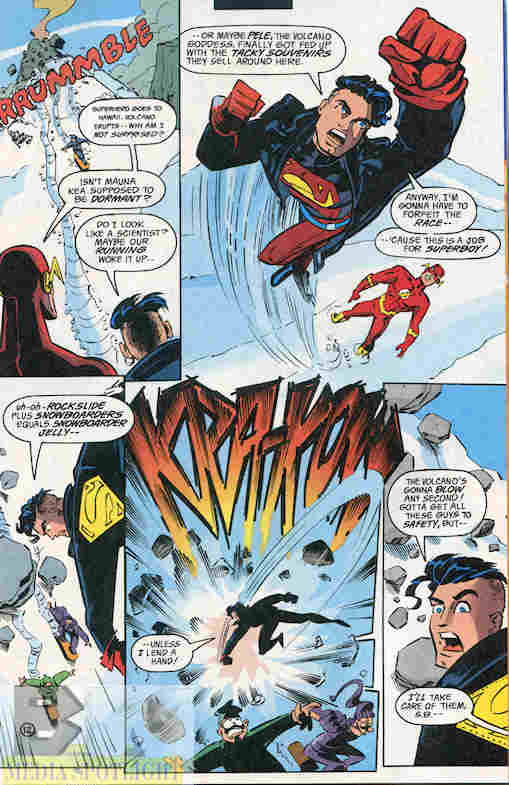 When everyone else does Friday Night Fights they focus on dudes beating each other up. I occasionally like to stretch the definition now and then to fights that are man versus nature (not versus animals necessarily, that’s Snell’s domain) or the like. Tonight I bring you one such fight. Also, it’s at a volcano and set in Hawaii. You can’t get more summer than that! Although Flash is only here to escape the Winter with his girlfriend…I’ll get more into it tomorrow.