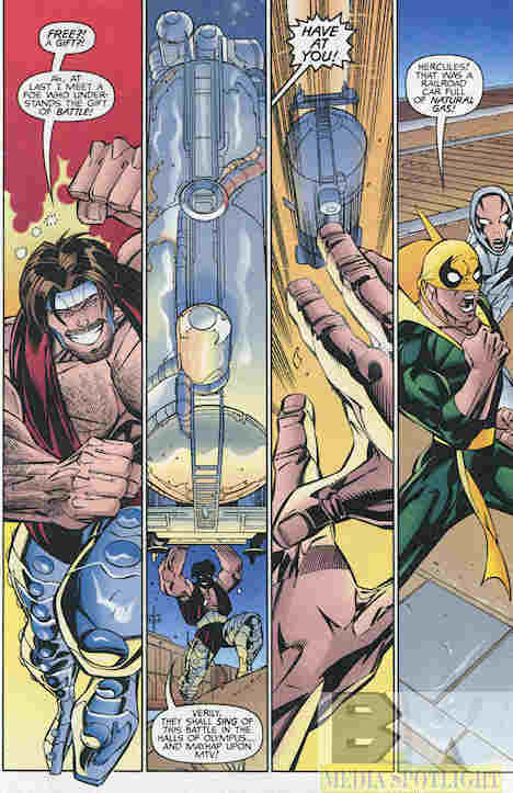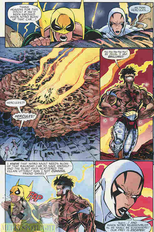 The Heroes were hired to stop Nitro The Exploding Man from exploding all over the railyards. Iron Fist and White Tiger made one big mistake: they brought Hercules along.