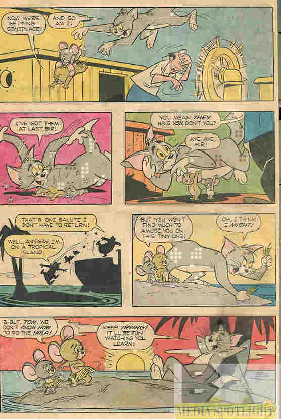 The captain kicks Tom, Jerry, and Tuffy off of his ship onto a small island, where Tom gets a little revenge for the abuse he didn’t deserve (because he did at times doesn’t mean he did all the time you know). (from Tom & Jerry #344)