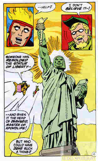 Ignoring that “Darkseid” and “liberty” are rarely in the same sentence, this is a horrible defacing. And the culprit is a Darkseid minion (presumably given that he turned the Statue Of Liberty into the Statue Of Darkseid) is Mantis, a villain I know nothing about. Seriously, I’ve never seen this character before but he did get his own Super Powers figure so we will be seeing him again. He didn’t show up in Super Friends/Super Powers Team or any of the Justice League cartoons afterwards, including the current one so far.