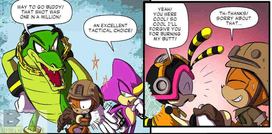 By itself it isn’t a bad short, the tale of a young watchman who wishes he were stronger forced to become a hero, and somehow succeeding once he starts using his head. As I noted above, Thomas is a good artist and the characters represent their counterparts well. Vector isn’t the rock n roller he is in the Archie comics, nor is he the goofball from Sonic X. His being a heroic fighter is quite believable compared to other versions. I don’t know what happened behind the scenes, but the end result shows a good team, and I’d like to see them team up for the IDW series.