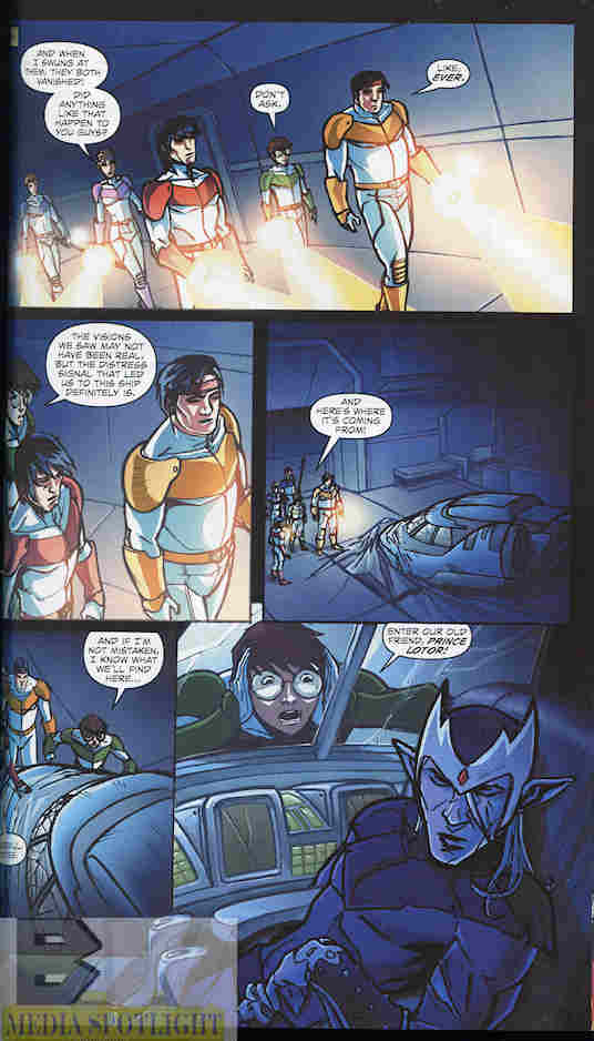 Back on the Arusian ship we left Allura meeting up with some Drule I don’t remember seeing before but Allura thinks was locked up, and who I assume to be an injured Lotor. She takes a swing at them with both with the staff, but they vanish, as does the rigged explosion Keith and Lance saw. The Voltron Force gathers back together, with Pidge and Hunk not willing to discuss what they saw. Why? Last we saw they were detecting a partly cloaked ship. What did it turn out to be, the Goodyear blimp? A giant clown car? I can only assume this wasn’t the story Croall was intending since that cliffhanger was thrown away far too easily to make sense. If that was her intention then it wasn’t a very good cliffhanger. Still better than we saw with King Of The Rocket Men though, so I’ve seen worse. However, they do find an injured Lotor, just as another Lotor takes a sword swipe at Allura before vanishing. Figuring out at least part of what’s going on, that this has something to do with Merla and Haggar, Lotor suggests everyone head back to Caladran.