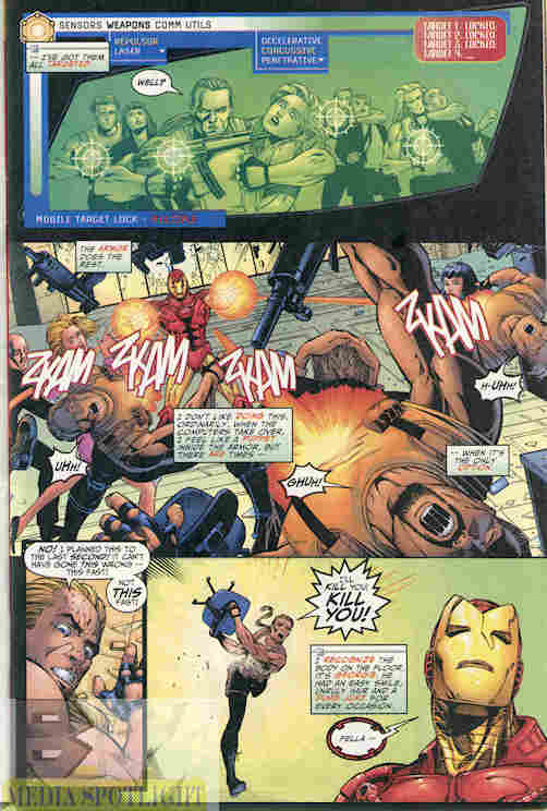 Iron Man uses his targeting computer to knock out the bad guys. (from Iron Man v3 #1)