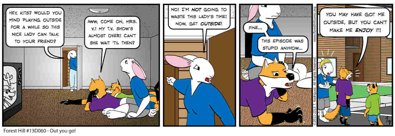 Forest Hill is the story of two families: the Locket family– single father Colin, his daughter Tanya, and his son Hunter–moves to Forest Hill because he is opening a new branch for a store chain in town. Events lead them to cross paths with the Velox family–single mother Flora and her son, Kaleb. In this story, the Lockets are foxes and the Veloxs are rabbits. Colin’s wife passed away due to illness while Flora’s husband was killed in a war. While the focus seems to have been intended for Tanya and Kaleb, all the characters have been at the front end of this, although currently Flora is more involved with the current plotline than Colin.