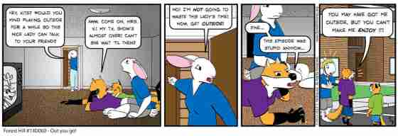 The first thing that stands out about Forest Hill is the mythos that is created. “Man” is treated like “God”, as they somehow created the anthros of this world and disappeared. The world itself seems stuck in the 1990s. There are no cell phones but there are pagers. The TV is SD 4:3 aspect, no widescreen. They have their own currency symbol in place of “$”. Words like “person” or “somebody” are replaced by “beast” or “somebeast” as denotes the rise of the animals to sentience. But this isn’t (currently anyway) some science fiction story about animals trying to learn their origins or in some obvious post-apocalypse scenario. They’re just living their lives trying to figure life out. Flora grew up in a commune but appears to be the equivalent of a Christian while the Lockets are “Jewish” and Kaleb’s best friend and his family speak with a typical Mexican, Spanish, or Latino accent. One of the Sunday strips features a Star Trek type sci-fi show where the characters find a object they believe to be humans but Flora turns it off for being potentially blasphemous. (She should see what the actual Star Trek cartoon did with the Devil. Speaking of which I wonder who their “Satan analog” is?) I don’t think Man is thought to be the same as we see God but they’re certainly revered and followed like a religion, though there are atheists as well.