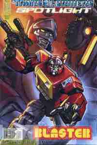 In this continuity Blaster was “The Voice”, a bot who would send transmissions that boost Autobot moral against the Decepticons, until that voice was silenced. He is found by a long haul freighter run by some organic species and returned to the Autobot command station Hub. Perceptor makes repairs and residence commander Silverbolt informs him that nobody knows who offed Blaster but evidence pointed to an Autobot. After another attempt on Blaster’s life, it’s nailed down to one of four Autobots. Blaster and the others set a trap to lure out the responsible party, who turns out to be Beachcomber, a victim of Soundwave and one of Bombshell’s cerebro-shells. Fighting against it burns out the shell but also part of his mind. Now Blaster wants to have a few words with Soundwave. Using his gun.