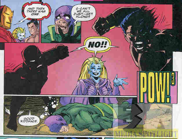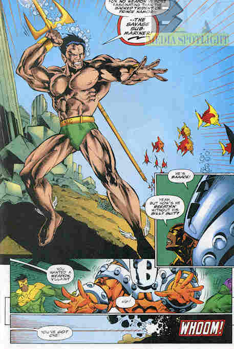 The Wrecking crew have Iron Man and Namorita outnumbered two to one, but then Namor arrives put the odds a bit more in the favor of the good guys. Apparently “good guy” came up on Namor’s coin flip today.