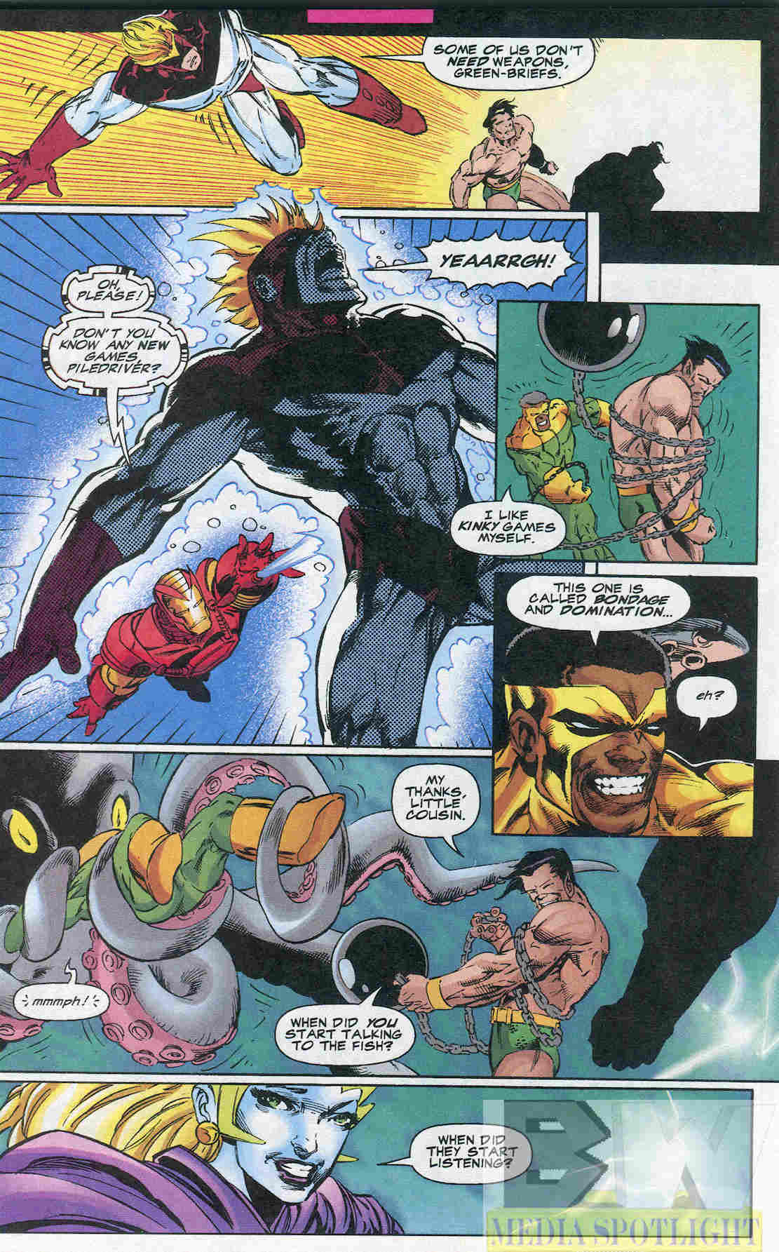 The sound effect suggests all three of them punched Wrecker, but only two are winding up. Maybe because we can’t see Namorita’s legs? Or maybe that’s Wrecker’s kink?