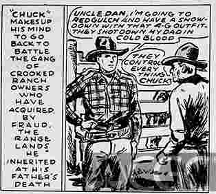 I wonder if “speed through the origin in five seconds” is going to be the trend here? Chuck Dawson’s father was killed in a range war and now bad guys have taken over the ranch. Now a manly man, Chuck decides to reclaim his birthright. Once arriving in his hometown he comes across a guy shooting into a saloon. The man orders Chuck inside but for some reason he doesn’t want to go into a building when it’s being shot through. Go figure. He takes the guy out in a fistfight (never bring guns to a fistfight after all) and the sheriff accuses Chuck of being a troublemaker. Apparently Notch Logan (no parenthesis, so apparently his parents named him Notch–I see why he turned evil) had every right to shoot into a saloon full of people? What? He also kicks Chuck out of town when he says he’s going after the 4-G gang to get his land back. Someone is bad at his job!