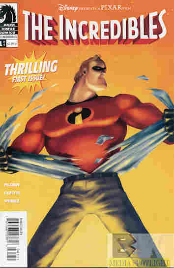 I’ve already reviewed the spin-off series from Boom Studios (now rendered moot most likely thanks to the sequel), but the adaptation I’ve bypassed until now. It opens in the city of Municiberg, where local hero Mr. Incredible runs into one problem after another, from having fellow hero Elastigirl take out the bad guy he was about to stop, to a suicide victim he has to save, to running into a bomber, to having him escape thanks to well-meaning but unready would-be sidekick “Incrediboy”, an inventor kid named Buddy. However, he makes it to his wedding slightly late, as he’s marrying Elastigirl. Then the suicide victim sued him, leading to a flurry of lawsuits, forcing the government to send the heroes into seclusion. Now living in Metroville, Bob and Helen Parr have to keep their superpowered children…superspeedy Dash and force-field user Violet, plus their baby brother Jack-Jack…under control. Bob is not happy with his current life and sometimes sneaks out with fellow hero Frozone to still fight crime and rescue people. Bob is also too helpful at the insurance company he works with for his skinflint boss and so he’s fired. Then he gets a job offer from another super named Mirage.