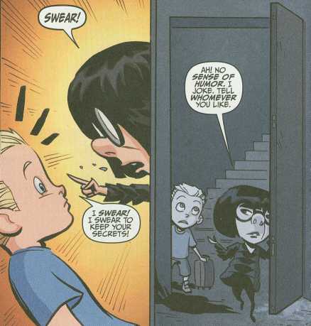 I’m not even sure how that name applies to Buddy outside of how Omnidroid learns how to kill supers. It’s highly possible he just picked a word that sounded cool and went with it. Just because you’re a genius doesn’t mean you’re a smart guy. And Buddy’s problem was he thought it would be cool to be a hero but didn’t understand what that meant. Maybe Bob could have taught him, but Buddy came on way too strong. He immediately assumed he would immediately be accepted as Incrediboy simply because he was Mr. Incredible’s biggest fan and knew a lot of trivia. It’s like making the case for the little kid on the Power Wheels bike being a superhero. He was a large part of Bomb Voyage getting away. Had he not been there (or if Bob wasn’t running off to marry Helen) Bomb Voyage would have been in jail, the bomb wouldn’t have destroyed the train track, and maybe someone would have taken more time to talk the suicidal man out of suing anyone or committing suicide. (Why go for the lawsuit instead of trying again? See, that plot point has so many problems with it.) The case could be made that “Incrediboy” was partly responsible for the supers having to go into hiding.