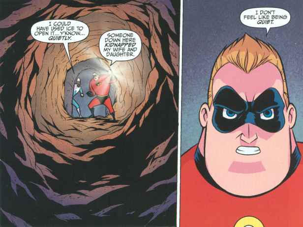 Meanwhile, Bob’s character arc is almost the opposite. He was always trying to be special and use his powers like Syndrome was with proving he could be a super. He thought it was all about being a superhero, that it was the only important thing about him. That’s what leads to the whole “celebrating mediocrity” commentary when it came to Dash’s graduation from fourth grade. (I did that too. We went from elementary to middle school. We also had one from middle to high school. I wonder what he’d think nowadays, when you get a trophy for showing up or “hey, you tried”.) As Helen and Violet had to learn to accept their super side and Dash had to learn control Bob had to learn that there was nothing wrong with the normal side of his life. We do see him becoming a better father and more romantic husband after he starts going on missions for Mirage. He feels like his old self again and even starts working out and everything. But it wasn’t until he realized how important his family was to him that he reached his character arc. Yes, in the golden age he talked about working alone, but that’s not his character arc; it’s just part of Syndrome’s motivation to kill him (also possibly why he named his headquarters “Nomanisa Island”, based on the only reason Mr. Incredible gave while not putting a rookie in danger while he’s trying to fight crime AND get to the church on time, which he also doesn’t do thanks to Incrediboy) and later to kidnap Jack-Jack. (Who names their kid “Jack-Jack”? Wasn’t “Jack” enough?)