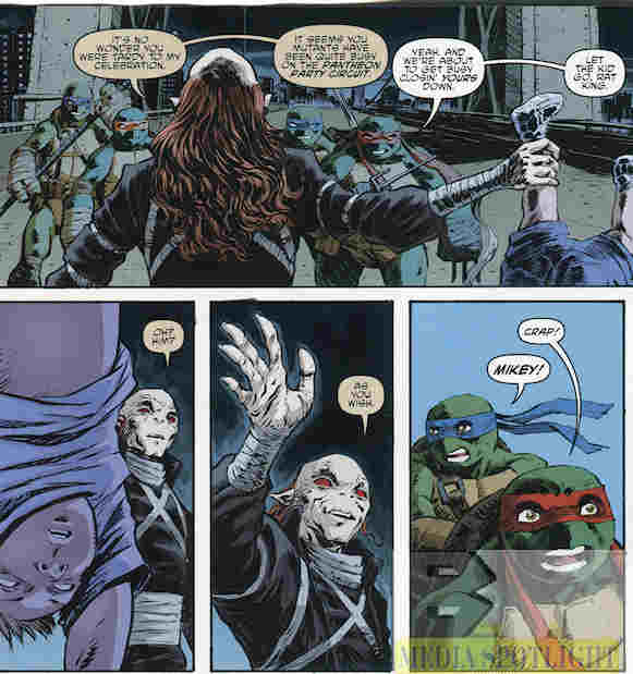 We continue where we left off, with Rat King holding one kid over the edge. He and the Turtles banter a bit and he can smell that they’ve been spending time with Toad and Manmoth. Raphael tells Rat King to let the kid he’s been dangling over the edge of a bridge and I’m sure you can already tell what’s going to happen next. Too bad Raph didn’t but Mikey uses his grappling hook yo-yo thing to catch the kid before he falls. So Rat King sends the other kids to pile on Don and Leo while Raph and Mikey deal with Rat King’s rats. And I’m guessing that’s also a result of his powers because I doubt they’d willingly follow him after he’s been biting their friend’s heads off. Unless they’re actually being written like real world rats who probably don’t realize stuff because they’re rats.