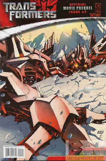 Now that’s out of the way, we have Archibald frantically writing symbols, which we know now is due to being hit by Megatron, which also led to the location of the All-Spark ending up on his glasses. The writing thing would come again in Revenge Of The Fallen during Sam’s various spaz out Cybertronian writing attacks. It’s probably not intentional since this was long before the sequel but it’s an interesting notation. It’s one of the things that doesn’t spoil the revelations of the first movie but you’ll still pick up more in hindsight after having seen it. We also see Megatron’s decent into his obsession for the power of the All-Spark and how that doomed him until he’s awakened in the movie. And I really like the coloring in this one. Some good effects. Even the annoying washed out black & white flashbacks are easier to see in this one.