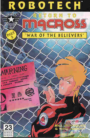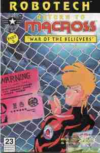 Nina meets with Roy in hopes she can talk Emil out of the debate. In turn Roy tries to show her the SDF-1 isn’t the monster she thinks it is, which Claudia misunderstands. Meanwhile, Anatole threatens Charles with knowledge of his attempt to kill Roy back in issue #4 (which I don’t own), but Charles decides to tell Roy himself, and how seeing Roy save people with the Veritech Battloid convinced him that Robotechnology isn’t all bad. However, someone kills Charles before he can appear on a talk show to denounce the violent arm of the Faithful.