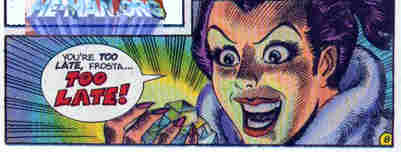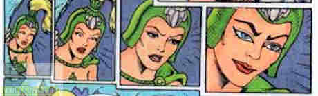As for Catra she’s somewhere in the snowy part of Etheria because that’s how ecology works. Then again, ecology on Eternia doesn’t always make sense to me either, but we’re only a few pages in and at 763 words as of the number. Besides, Catra actually has a cape on to keep her warm…even though she’s still bare-legged and sleeveless so it’s only a slight improvement. Plus the cape is the cause of all the problems, the “treasured Snow Cape” belonging to her prisoner. The prisoner is Frosta, and for some reason the snow sorceress wearing a strapless top isn’t as confusing to me. I mean, if Mr. Freeze can go swimming underwater in a speedo, why not her? (And I know who I’d rather see in a…no, nobody looks good in a speedo.) Double Trouble disguises herself with a face Catra believes is a friend. And as usual…