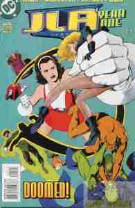The Brotherhood uses the Locus teleportation guns to graft citizens’s parts onto their protoplasmic army. This brings in the Doom Patrol to investigate but also the Justice League drops by. Earlier, the Coast Guard agent Aquaman befriended was in the JLA’s cave headquarters (without their permission) reading dossiers on members and talking about Locus before avoiding Snapper, while Black Canary makes sure any of her teammates aren’t married after learning her mother had an affair with a married member of the Justice Society. Now their biggest problem is that they’ve had their parts grafted to a protoplasm creature…which is also grafted to the brain of the Brotherhood’s leader, the Brain.