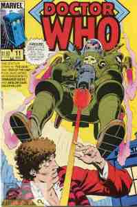 Doctor Who #11 is one of my favorites because it was the first Doctor Who comic book I ever bought. I bought it in 1986 in the back issues of a comic store in the area where I grew up. For a middle schooler like me in 1986 to have found a Doctor Who comic just a few months after my friend Tim introduced me to the world of Doctor who was quite magical indeed. So there’s lots of nostalgia value for me with issue #11. I still have it. So glad that I never sold any of my Doctor Who comic books or novels.