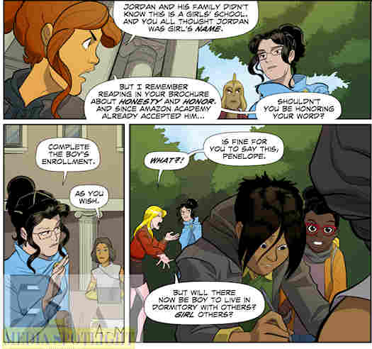This first chapter introduces a unique bunch of characters. Jordan, the aforementioned X-Chromosome, will be staying with the handyman and Pegasus wrangler Festus, who even the bitchy girl Theodora respects despite her hatred of boys and Americans. (The expression on her face when Festus tells her off is just the best.) I’m hoping he doesn’t turn out to be transgender or something not because I don’t want to see a transgender character–that might actually be interesting down the line since I don’t otherwise see it in this cast–but because at this stage I think it would be a cop out to make the lone boy see himself as a girl if that’s his secret. Jordan’s arc appears to be needing to learn confidence and maybe with the help of Festus and a group of warriors and warrior goddesses as his instructors, Jordan will “man up” while avoiding the “toxic masculinity” problem. (There is a difference between masculinity and toxic masculinity.) If it seems like I’m focusing too much on the one boy it’s because being the one boy stands out and I am curious how he’ll be used in the story since this is an all-girls boarding school and Jordan is only there because Jennie, who I’m expecting to be the most interesting of the group, convinced them to keep their word. The comic would have been fine without him but having him here may have possibilities. (Imagine if the series ends with Jordan and Theodora dating. :D) It’s also the second most interesting scene in the first chapter, the Pegasus of course hitting the top spot. It’s too soon to select a favorite character, but I’m hoping Jordan, Rose, and Jennie will be besties. Speaking of boys, I’m hoping the anti-girl Paul brother stand-ins aren’t going to show up again. They didn’t seem to have much of a point except to be the one thing Theodora does that I liked. Maybe it shows she isn’t all bad, or why she hates boys? I think she’s going to be the big antagonist in this series.