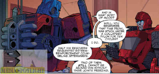 Also they take a popshot at Prowl by comparing Megatron’s attitude to the time Prowl was trapped under a pylon for 10 cycles (the Cybertronian version of an hour, but not necessarily as long) and his anger apparently scarring a couple rescue workers for life. Why does IDW hate Prowl even when Simon Furman isn’t writing about him?