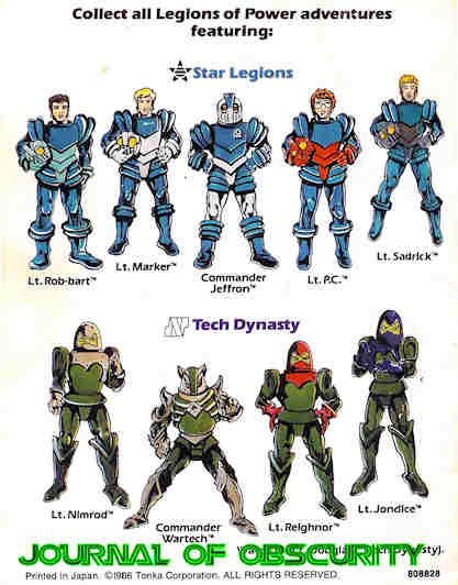 The backstory for this toyline is set on the planets of Konn and Prolon, two planets at war as the Tech Dynasty, led by a guy named Wartech so you know what his parents had planned for him, wants to add Prolon to their empire. Prolon’s Star Legions goes up against Konn’s forces. Then one day a bunch of high-tech components rain down on both planets because a space probe explodes between the two planets. I have to wonder how big this thing was and how it was designed because there’s enough of the right junk to allow both sides to use them to create battle vehicles to…well, go into battle in vehicles. Why stop now? It’s what they’ve been doing all this time anyway.