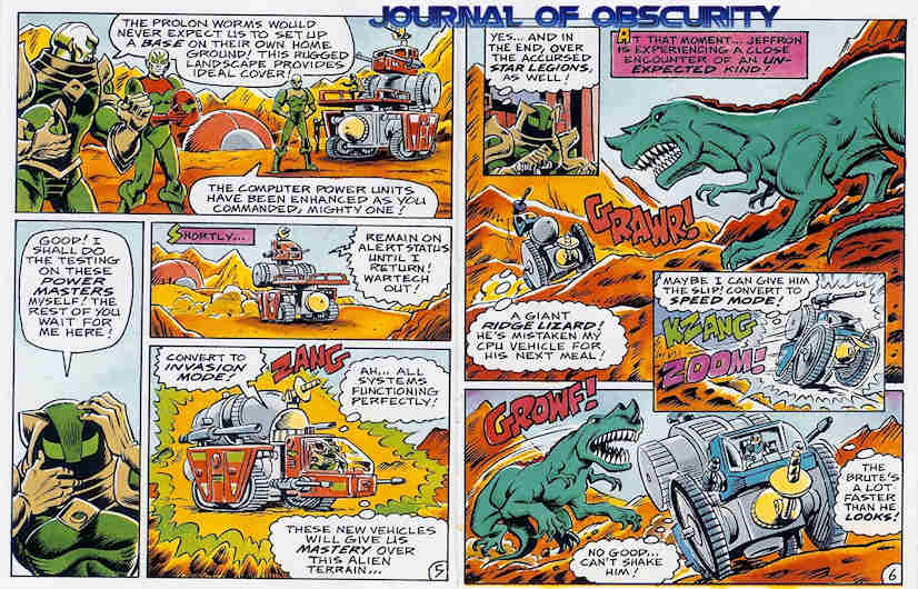In the present Wartech follows the sounds of the weapons fired Jeffron used to chase off the Ridge Lizard and starts attacking him. Unfortunately for him Jeffron’s vehicle was configured for speed and the canyon they were in was configured to fall apart when someone sneezed. Wartech is forced to abandon his vehicle in hopes of reclaiming it later but the Star Legions find it first. P.C. asks how the test went otherwise and Jeffron said it was perfect, including their secret weapon…Wartech’s own stupidity.
