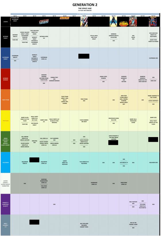 Especially since Generation Four is apparently ALSO the “Age Of Crisis”, because DiDio is obsessed with crises and the number 52. It’s basically the New 52, DC You, Rebirth, and the Re-52ed DC periods. That’s why it’s the shortest and the biggest waste of them all. No Xs, no black boxes, and nothing worth talking about. It’s DiDio’s DC and he’s ruined it for the rest of us. So the DC timeline, which still includes World War II, is now about 60 years long, and that all leads up to Generation Five. Not that it matters because this won’t last. DiDio can’t leave well enough alone and we’ve seen writers who don’t care about continuity (remember, Bendis is still screwing over Superman and the Legion Of Super Heroes) so this will change in a heartbeat.