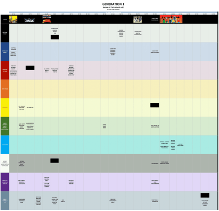 Generation One begins with the Wonder Woman as the first public superhero until the appearance of Superman, which starts the second generation. The third generation spans the time from Crisis on Infinite Earths (1986) to Flashpoint (2011). The fourth-generation would then cover the events of The New 52 through Rebirth – aka the present day.