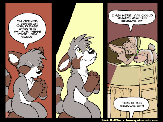 No, we’re not talking about Facebook pictures of your cat riding a roomba or YouTube videos of your puppy playing with a stuffed tiger. Housepets! is the name of a webcomic by Rick Griffin started in June of 2008. (So it’s slightly older than this site.) I stumbled across this one looking for images of other things and was hooked rather quick. As of this writing I am not completely caught up on the comic but I have wasted many hours trying because I just really enjoy reading it.
