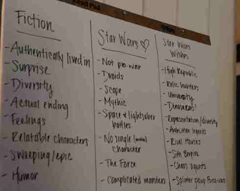 The final list are what the writers want to do with the franchise and it’s a mixed bag. “High Republic” is the first project, but they want to include dinosaurs. Why? Because dinosaurs are cool? Granted, dinosaur Jedi/Sith with a lightsaber would make a fun art piece but how would you make that work? Then you have un-Star Warsy things like “rival houses”, which is more Game Of Thrones or Dragon Age than the action science fantasy built on Japanese samurai movies and 40s science fiction serials. Not that some European influence like the Arthurian legends doesn’t have potential and I’m curious what they mean by “relic hunters”, but it seems like it’s more “stories I really want to write” more than “things that are classic Star Wars”. Column 3 should fit in with column 2 more than it does. The idea of a splinter group of Force users have potential in not being Jedi or Sith, maybe a good counterpart to the Nightsisters or something. I wish I knew if any of this was thrown out and what the discussions were actually like but I wasn’t there.