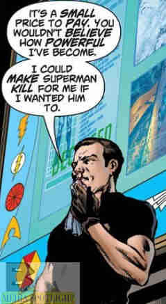 OMAC beats the tar out of Blue Beetle and locks him away. In the cell Max tries again to recruit Ted. However, as he explains the OMAC, the “Brother One” satellite that will become Brother Eye in a later event, and how he wants to take the course of human events away from the superhumans and into the hands of “normal humans” like himself and Ted (Max somehow keeps forgetting he’s a metahuman who we will see CAN control Superman), and as he even praises Ted for never giving up, there’s only one thing going through Ted’s mind.
