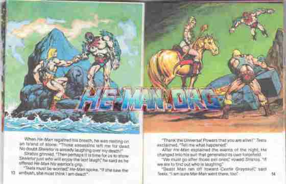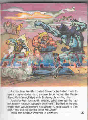 Our tale opens with Skeletor on top of a volcano having a sword fight with lightning using his energy blade (the two halves of the Power Sword are scattered to the winds here–it isn’t until the actual comics of season 2 that Skeletor and He-Man carry their toys’ half of the Sword). We all have our hobbies I guess. He starts thinking about how He-Man and his friends have kicked his butt time and again. Oddly Skeletor also focuses on Teela, while Man-At-Arms, the only other ally in the image, is just “his friends”. I guess given what happens in series 2 that’s…still creepy. He summons Beast Man and Mer-Man to Castle Grayskull because nobody ever patrols the place. He orders them to attack He-Man when he doesn’t have his superweapons. That would be the gifts of the Goddess from the first book–a harness that boosts his strength, one that creates a forcefield (and he can only choose one at a time), his axe, and his shield. That’s worked so well in the wishes of Skeletor because it hasn’t in these booklets.
