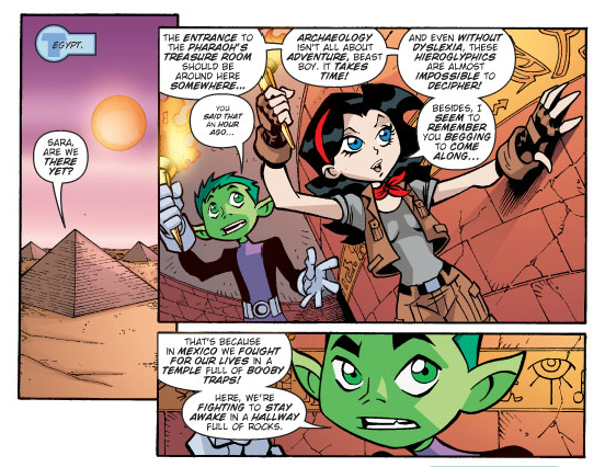 On the Titan’s end this is more like a Beast Boy story where the others chime in for the traps and to encourage Sara. Starfire does pretty much nothing and neither does Raven really. Cyborg blasts some traps, Robin does rescue Sara from a surprise trapdoor, and that’s it. They aren’t even in the second story as it’s just Sara and Beast Boy on a treasure hunt, and to be honest I’d probably watch that show. The two are good friends without being a potential couple, though Sara does call Beast Boy “Beastie” in both stories. They have good platonic chemistry together. We don’t see much of Sara’s dad. Apparently he’s letting Sara and Beast Boy just wander around a pyramid without any supervision and I do wonder where that helicopter came from, why Sara and Beast Boy are riding on the bottom of the ladder as if they snagged it in flight, and what happened to the others at the end of the story. Are they in the copter?