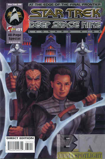 Our backup story has Dax again off the station, this time on a Starbase to deliver a speech. She’s rescued from an assassination attempt (I see this comic’s theme) by Gwyn, a Trill introduced in a previous issue I don’t have, and his Klingon partner (I don’t think romantically). A new race seeking Federation membership is not comfortable with the Trills joining with symbionts due to their religion but one sect has decided to “save” them by killing them, and Dax is their next target. Apparently Jadzia and Gwyn have some attraction to each other which comes up but they both have different views of Starfleet. Thanks to a comment by Tev about her partner’s stupidity in courting Dax they come up with a plan to expose the sect members on the base and stop their plan.