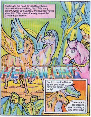 Moonbeam gets his sister, Crystal Sun Dancer…still not the crossover and apparently everyone is named Crystal X around here. I guess if Adora ever does touch the ground she’d have to call herself Crystal Adora. Sun Dancer knows the way across the barrier…somehow…but in order to get them across they need to be able to fly. Luckily the power of Grayskull reaches into this place so Adora transforms into She-Ra and Spirit into Swift Wind because at this point the mini-comics have abandoned any semblance of a secret identity. I wonder if the producers of Princesses Of Power just read the mini-comics and assumed the show was like that without watching it? It would explain so very much. By the way it’s taken 11 pages to finally get Adora into her superhero form, about two-thirds of the comic that is at best three panels per page, with most of it done in narration, including dialog. Was this their first comic?