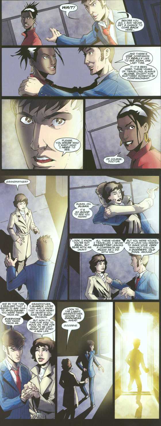 In the initial review, part of that week’s comic haul review, this won Best Scene Of The Week. It’s nice getting to see the Doctor spend some time with Susan, his very first Companion really, even if it isn’t really her. Sadly the show has failed to make this happen, though between Doctor Who and The Sarah Jane Adventures we have had Sarah Jane and Jo Grant make appearances in story, and “where are they now” type shorts to promote new DVDs with Ace and Mel. They need to do this while Carole Ann Ford is still with us.