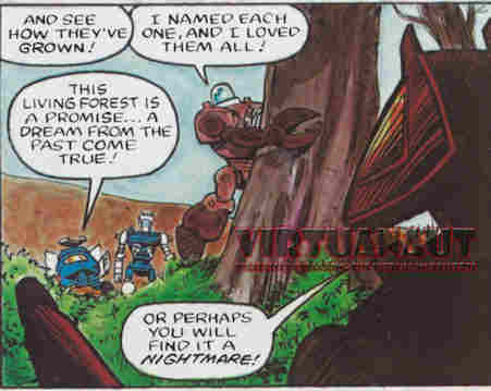 The comic starts with Crank arguing with Think Tank. The other Protectors are worried Crank might accidentally damage Think Tank until their leader Hotshot stops him. (Nowadays “Hot Shot” is a popular Autobot name.) Think Tank has explored this area before and thinks going North will get them closer to where man lies in hybernation but something is drawing Crank to the West. They decide to go West for a while but as it looks like they’ll find nothing they come up on a forest. Crank used to be a botanist, which brings up a few questions based on his model name (Wastor) and the big honking drill on his chest, but this is the forest he used to work on. Now they’ve grown into very big trees, a sign that whatever messed up Earth in this universe may no longer be an issue and plant life growing is a good sign for mankind.
