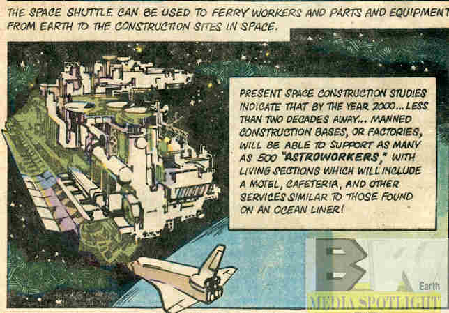 The book opens discussing the recent first launch of the space shuttle Columbia before going into a discussion of future plans, like a space station that holds 500 workers, a motel, and a cafeteria, with the shuttle being used to bring people and supplies to and from Earth. In late 2021 that’s both cute and disappointing when you realize all we have is some floating space lab with probably less people than these kids’ classroom…and it looks like a very small classroom compared to Ms. Wilson’s class. The design is something out of science fiction, which as of 21 years after her prediction it still is.