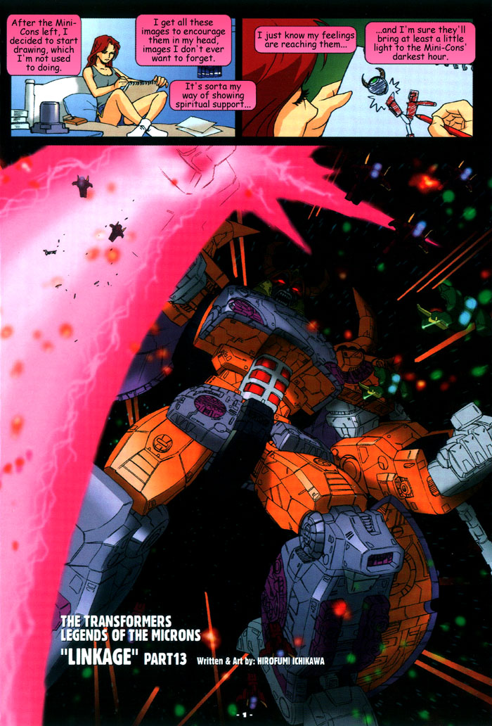 For those of you who missed yesterday’s article, here’s the catch-up. Also, here’s the link to yesterday’s article. Transformers: Linkage is a set of minicomics packed with the Legend Of The Microns (or as we know it, Transformers Armada) DVD sets in Japan, at least during the first run of DVDs, which also came with exclusive Mini-Con/Micron recolors. Linkage tells their story in a thirteen chapter set of three to four page minicomics written and drawn by Transformer fan turned creator Hirofumi Ichikawa, translated for English speaking fans by regular comic editor and translator Doug Dlin and re-lettered by another fan turned creator, Greg “M Sipher” Sepelak.