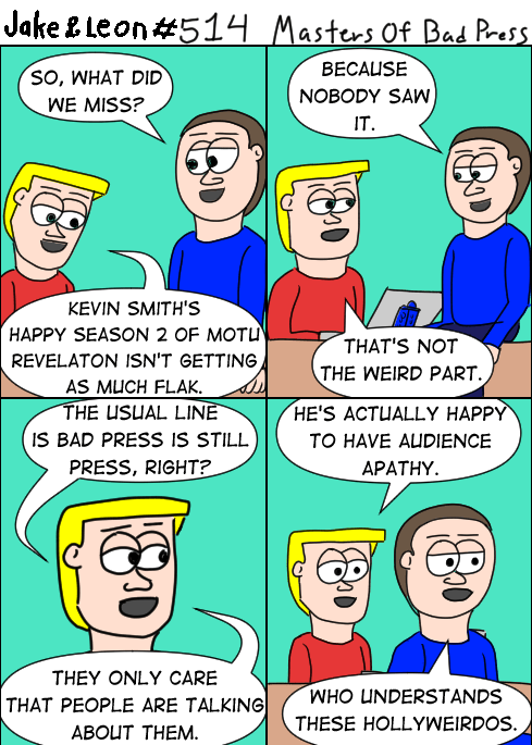In my YouTube catching up I just found out about this. I guess Kevin Smith would rather have nobody talk about him than hate him, which is the opposite of what I usually hear out of comic writers and others in entertainment. “At least they’re talking about me” is their usual defense, but why you’d be happy nobody is talking about you instead of trying to do a better job–or why you’re just happy to be talked about even if it’s to tell you how much you suck are thought patterns I can’t wrap my head around. There will always be people who don’t like your work, but why encourage them to not like you MORE?