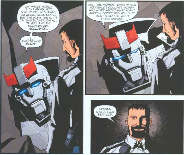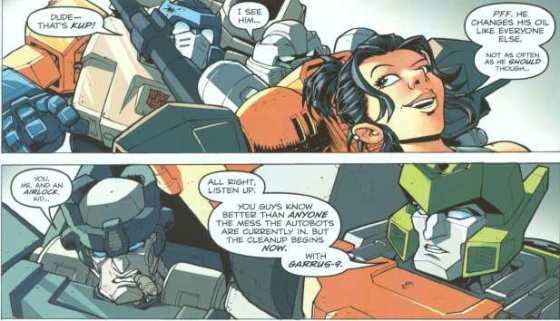 Then there’s the human interaction. With a few exceptions (like the example above) in various one-shot stories, as a whole the relationship between the Autobots and the human race was nonexistent to hostile. I’ve written before about how I think humans and Autobots getting along is rather important and in character with typical Autobot depictions, something none of the comic runs have offered, Dreamwave came close as both sides started to shake off that first miniseries, but never really taking that leap over. At least they had a good excuse after what “Lazarus” did but that doesn’t excuse Buster’s reaction. Meanwhile, IDW had numerous Sector Seven wanna-bes (one of which was run by a mad scientist version of Scorponok), the Decepticons replacing top human leaders to set off the end of the world, Spike appearing to be ready to accept the Autobots only to have that undone by the next writer and having him kill a Construction when he could have been brought in as a POW, and Jazz killing a human carrying a Megatron replica gun that was being distributed as part of a plan to start an Autobot/human war. I prefer my Autobots and humans being friends, and Optimus annexing Earth into some Cybertron empire isn’t it.