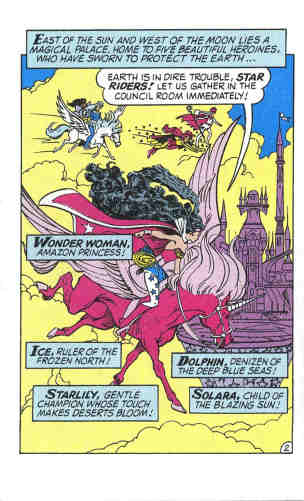 The first page gives us our setting: “East of the sun and west of the moon”. No mention if they’re caught between said moon and New York City. (There’s a forced reference not enough of you will get. Let this link help you. The line put the song in my head and I’m not in a suffering alone mood right now…plus it’s a good song. Haven’t seen the movie.) It’s here that we meet our Star Riders. Wonder Woman, of course, Dolphin, Ice (interestingly both also the name of DC Universe characters but not them), Starlily, and Solara. Respectively their champions of…well, Diana’s just listed as “amazon princess”, but the others are champions of the frozen north, the deep blue seas, desert flowers, and the sun. Kind of random on this one.