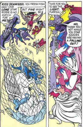 Unfortunately, with the sea gem in Purrsia’s possession the oceans are going crazy and the villainess uses the distraction to capture her. The other Star Riders show up but with all the gems Purrsia is a match for them until Wonder Woman breaks out her sword…no, sorry, that was 2000s Wonder Woman. This is the 1990s, so she uses that other weapon she’s famous for, her star-shaped magic wand. Remember how she took down Maxwell Lord painlessly with that and used her magic to end his ability to control Superman without killing him? Now I wish she actually had that. Yeah, no magic lasso, no deflecting bracelets, no tossing tiara, no…whatever the heck her belt was supposed to do, and of course she has a Pegasus who doesn’t even turn invisible. How is this Wonder Woman?