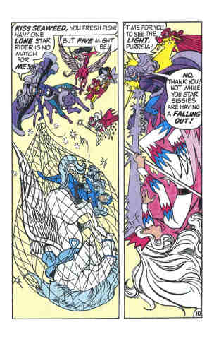 Using her magic mask and her flying panther Panthera, sure why not, Purrsia sneaks into the palace and grabs the sea jewel from the super-secret hiding place…in Dolphin’s vanity drawer. Dolphin senses it and the Riders run to her room. Purrsia uses a “slumber jem” to put the others to sleep but Dolphin manages to protect herself in a bubble. With the others out, including the who actually is based on a DC character and not just sharing a name while also being the title character, Dolphin goes after the villain herself on her winged horse Clouddancer. Oh, I didn’t mention that they all have Pegususes (Pegusi?) in this comic except for the villain who rides her cat and berates her all the time. Luckily none of this made it into the DC Extended Universe. I hear Wonder Woman ’84 had enough issues.